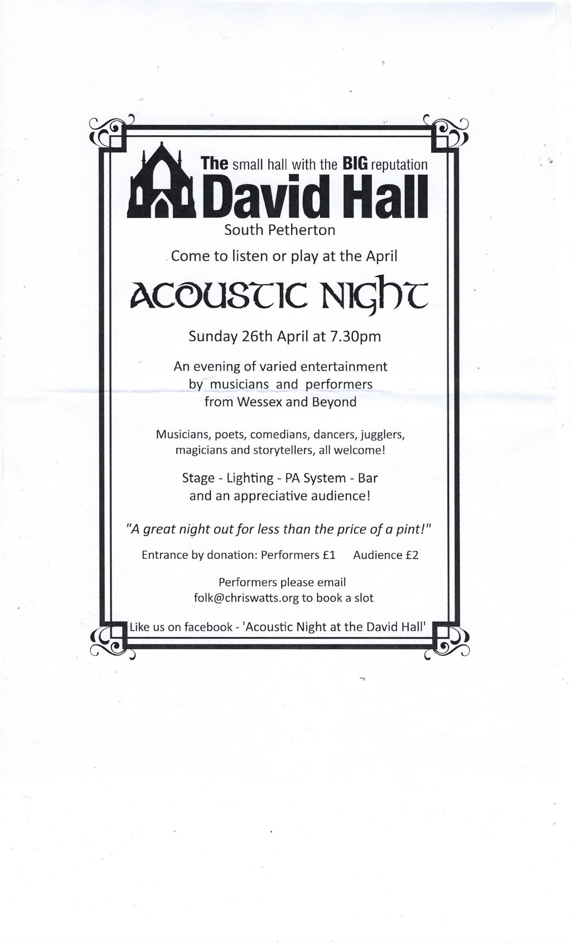 Entrance by donation: Performers £1 Audience £2
