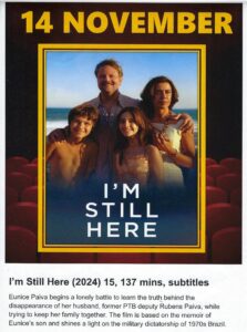 I’m Still Here is a Brazilian, political biographical drama, based on Marcelo Rubens Paiva’s 2015 memoir of the same name. It stars Fernanda Torres and Fernanda Montenegro as Eunice Paiva, a mother and activist coping with the forced disappearance of her husband, the dissident politician Rubens Paiva (Selton Mello), during the military dictatorship in Brazil.